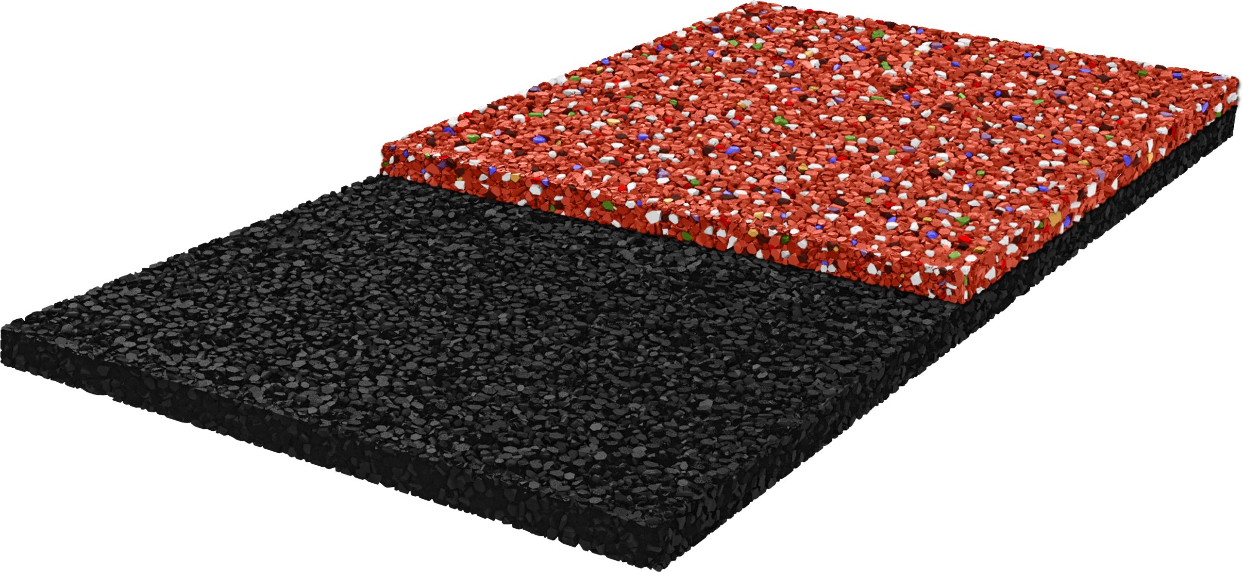 Az SBR granulátumból készült alsó rugalmas rétegre CONIPUR EPDM és CONIPUR Nike Grind granulátumok keverékéből készült felső réteg készül. Ezek együttesen egy kiváló minőséget és tartósságot jelentenek. A Nike Grind ujrahasznosított granulátumok a fenntarthatóságot erősítik, ugyanakkor esztétikus, minden téren kiváló burkolat. A Nike Grind granulátum több színű EPDM keverékekből áll, amihez igény szerint különböző CONIPUR EPDM alapszínek keverhetők.